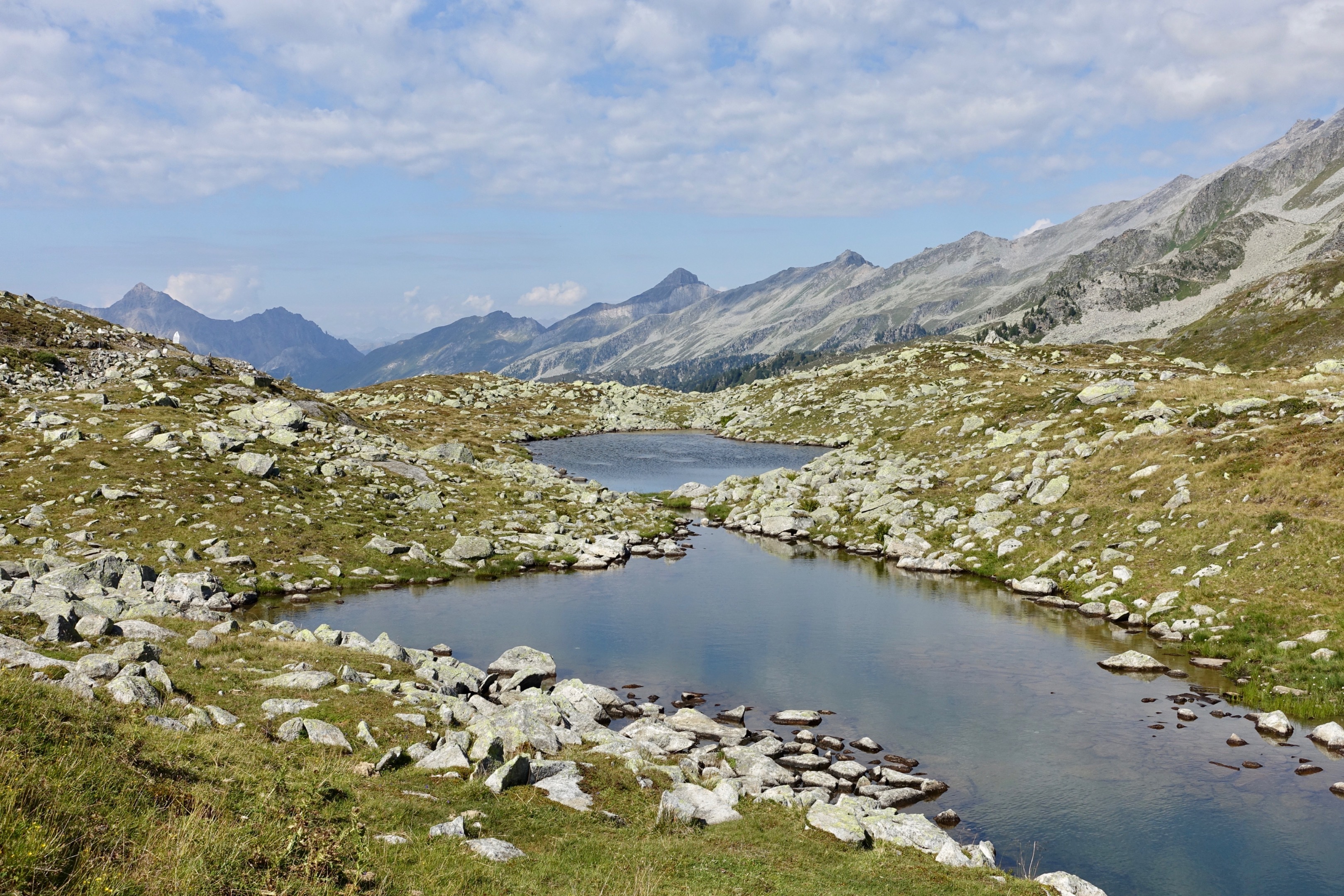 Heute morgen sassen wir gemütlich am Frühstückstisch. Der Himmel blau, der Blick gegen Süden gerichtet, unsere Aufstiegsroute noch im Schatten und zu hinterst eine stolz aufragende, weit entfernte und bereits von der Sonne beschienene Bergspitze. Der Berg ruft. Wir befinden uns wieder in einem alpinen Abschnitt unserer Wanderung und die grasbewachsenen, harmlosen "Hügel" liegen hinter uns. Das Herz schlägt höher und wir brechen auf. Die Stimmung ist hervorragend und unsere Schritte schaffen den Austieg auf den Pass mühelos.