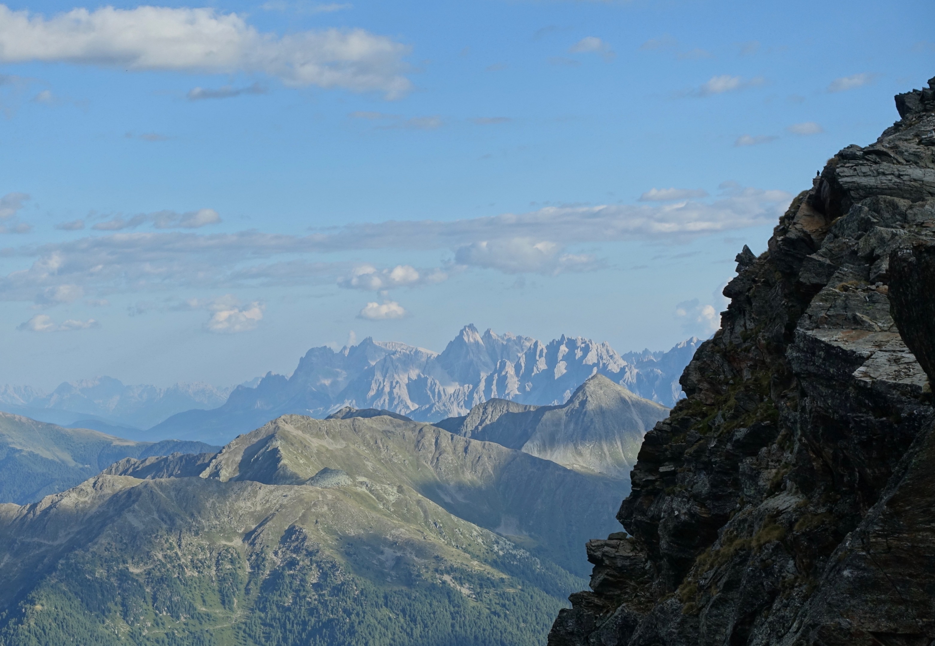 Nach einem stetigen und anstrengenden Aufstieg kamen wir heute bereits um 14 Uhr an unserem Tagesziel an - der Riesenfernerhütte auf 2800m. Als Belohnung für diesen schweisstreibenden Effort gönnten wir uns einen feinen Südtiroler Kaiserschmarren. Eine weitere Belohnung erwartete uns draussen am Rand des Abgrunds mit Blick ins Tal. Wir genossen die Faszination des Wolkenspiels in den vor uns liegenden Bergketten. Diese mächtigen Riesen strahlen soviel Ruhe und Schönheit aus. Ein Stück Ewigkeit.