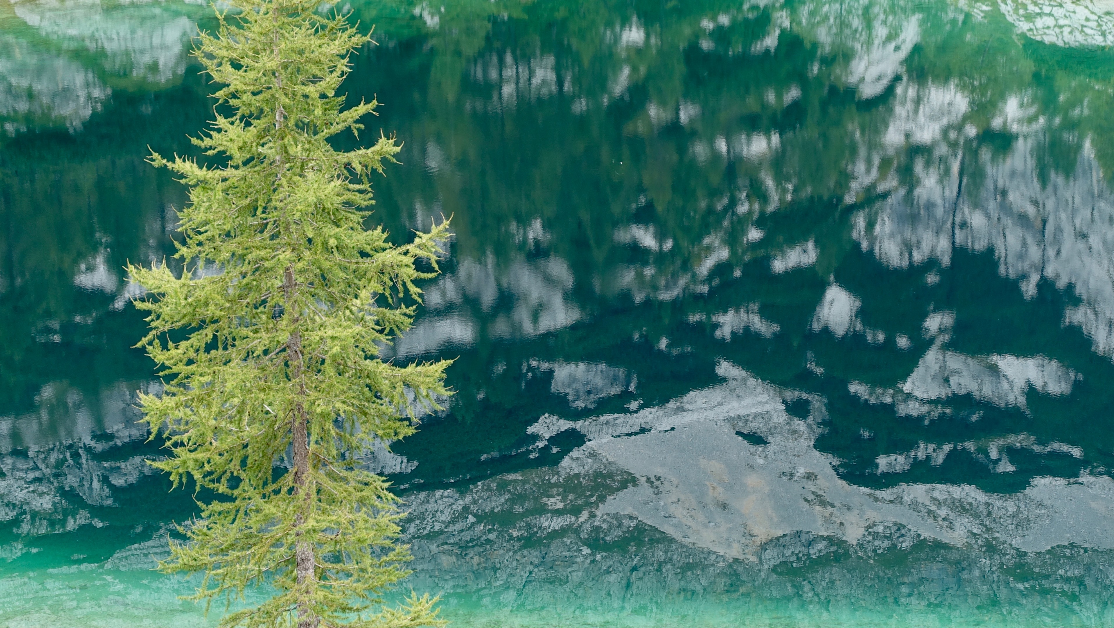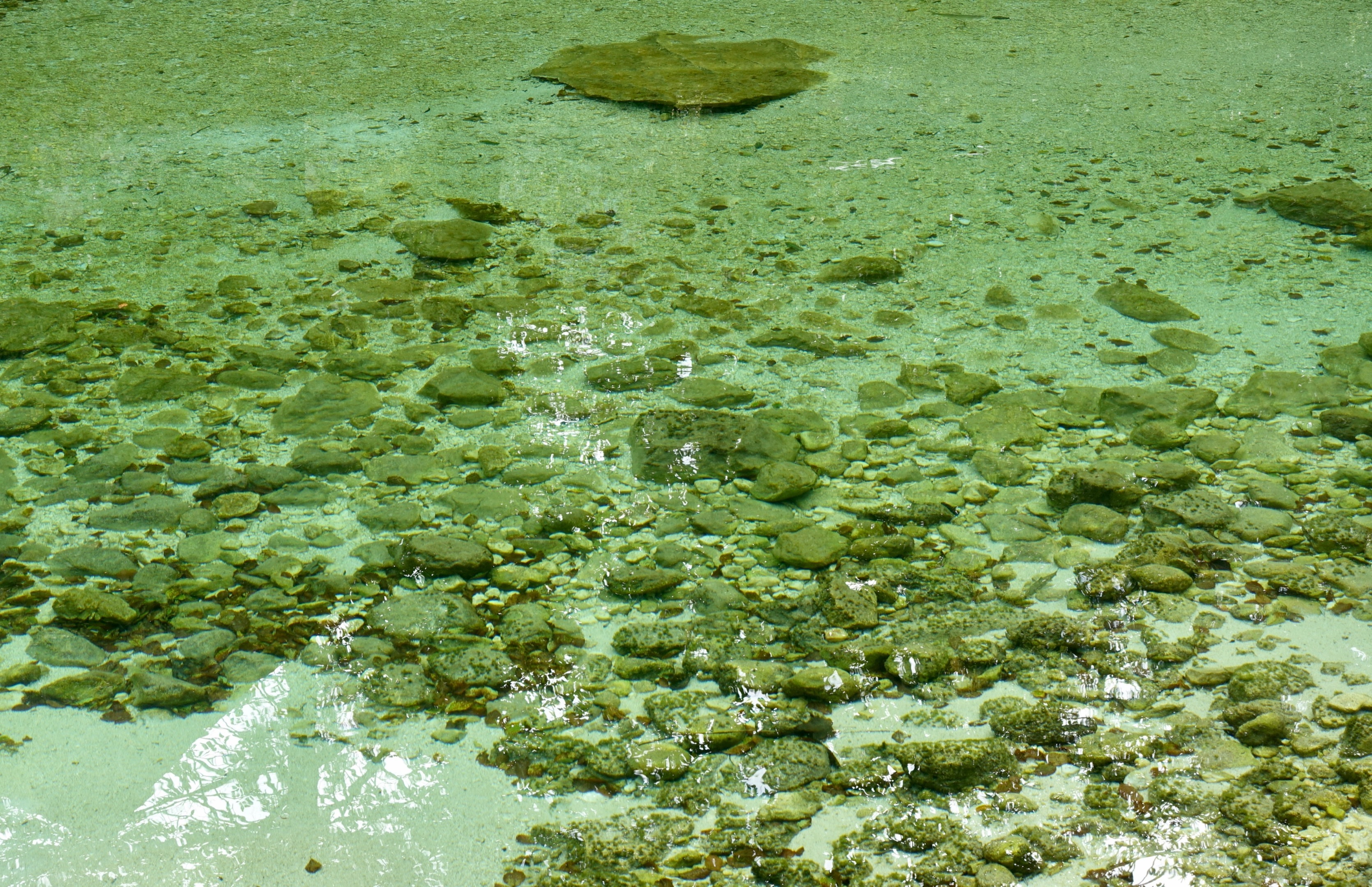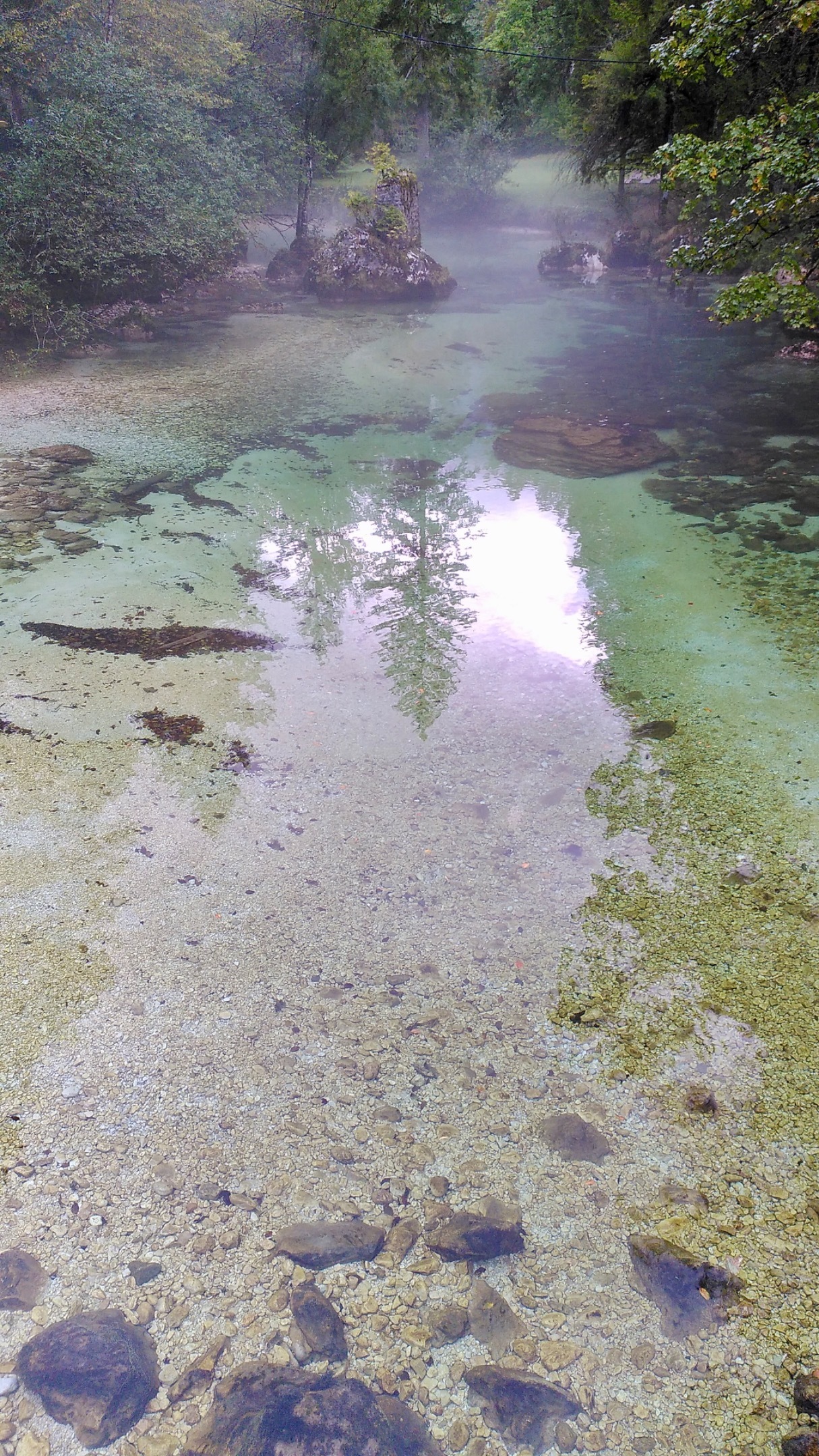 Die smaragdgrünen, glitzernden Bergflüsse, die sich tosend durch die zerklüftete, hellgraue  Karstlandschaft schlängeln, ziehen den Blick magisch an. So sind wir bereits staunend der Soča und der Savica gefolgt. Aber auch die höhergelegenen Bergseen fesseln den Blick durch ihr kristallklares Wasser, das die Betrachter/in buchstäblich mit in die Tiefe zieht, sodass nicht mehr klar ist, wo die Realität endet und das Spiegelbild anfängt.