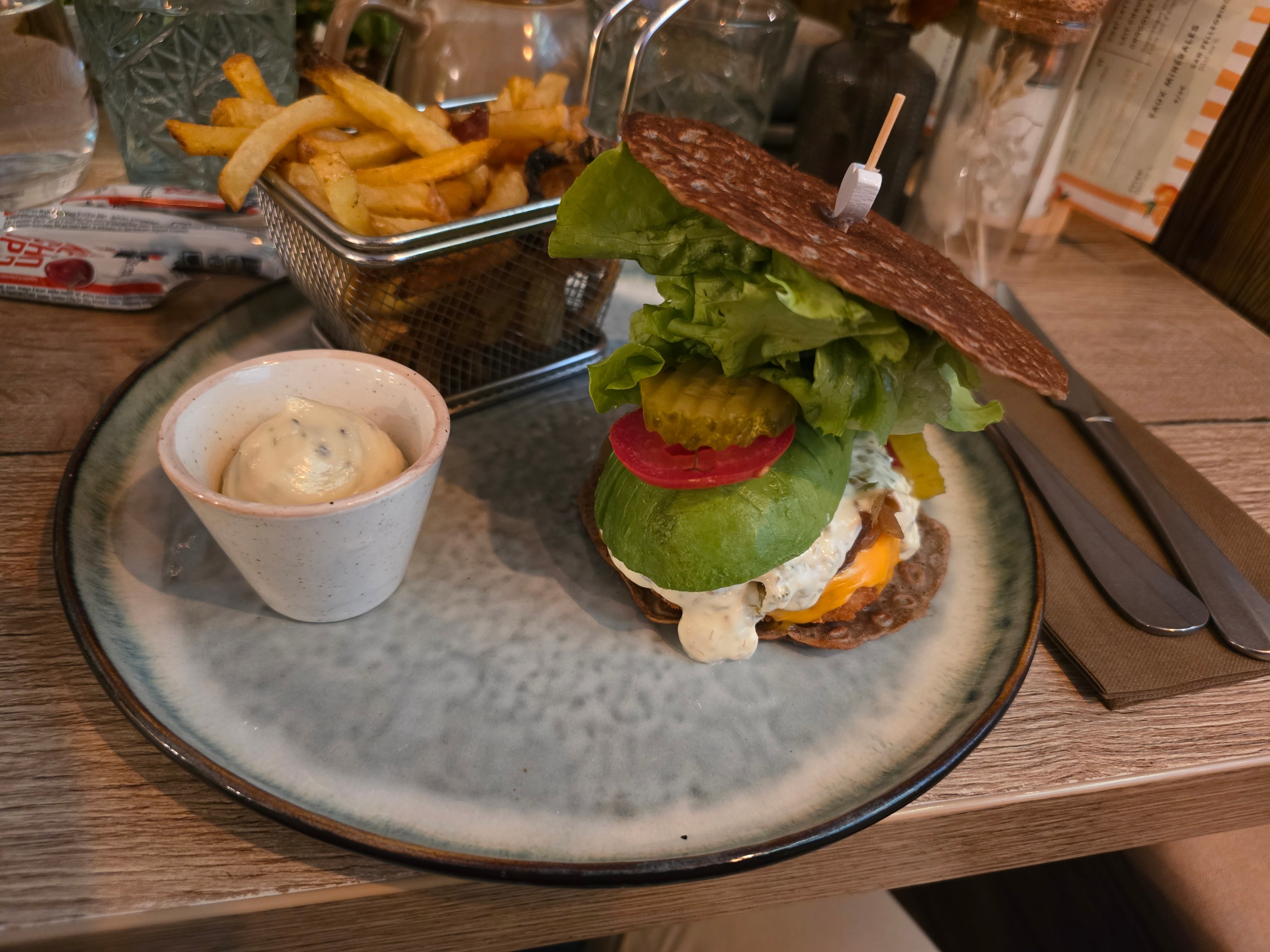 Gestern assen wir in einem hübschen, kleinen Restaurant sehr feine Galettes oder Végi-Burger und eine Kugel Glacé