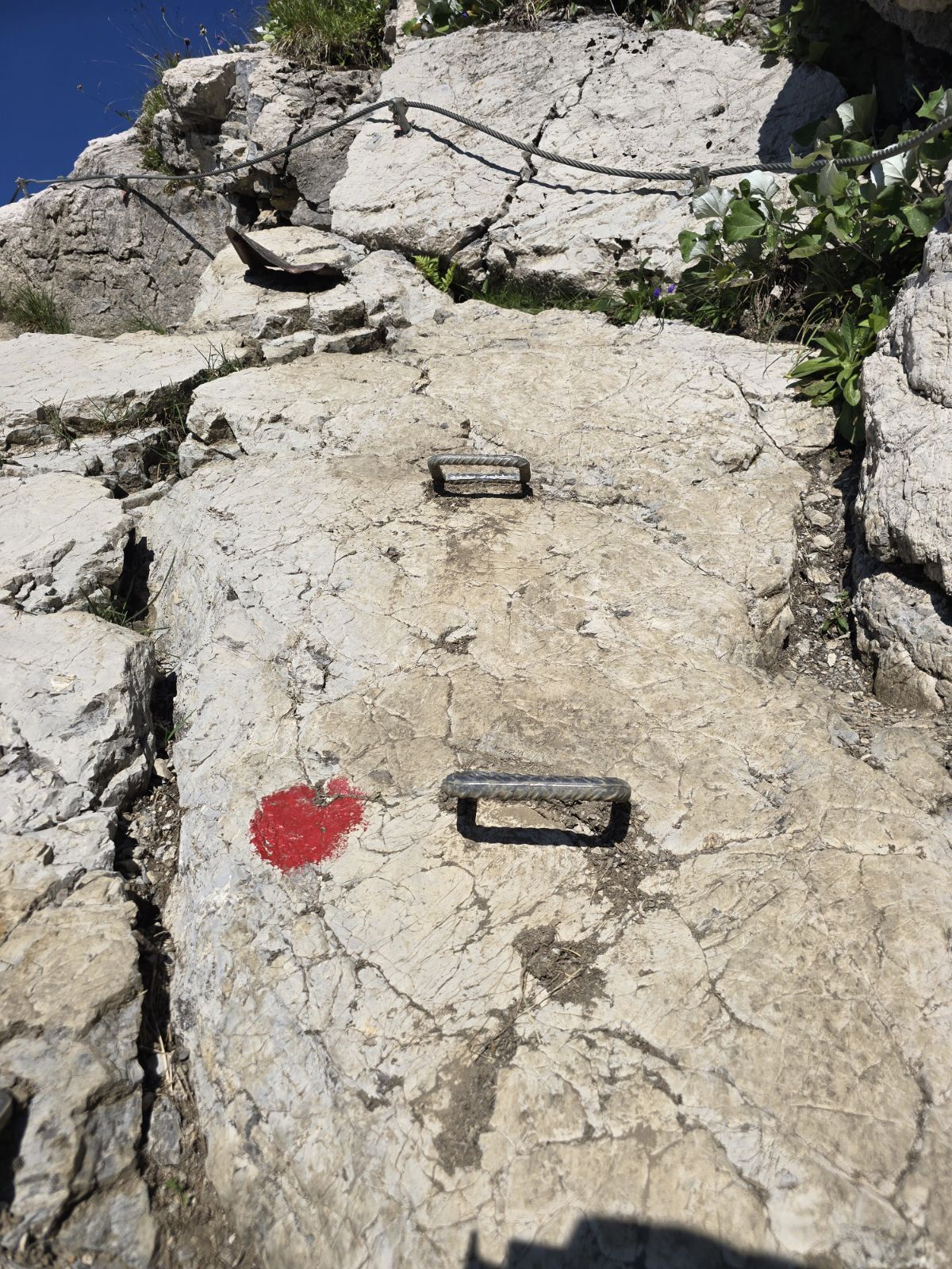 Hilfreich sind auch Tritthilfen. Das sind Bleche oder gebogene Armierungseisen, die im Fels verankert sind und die wie Treppenstufen über rutschige Felspartien führen. Meist hat es da gleich noch ein Seil daneben. Auch davon hatte es auf der heutigen Tour einige.