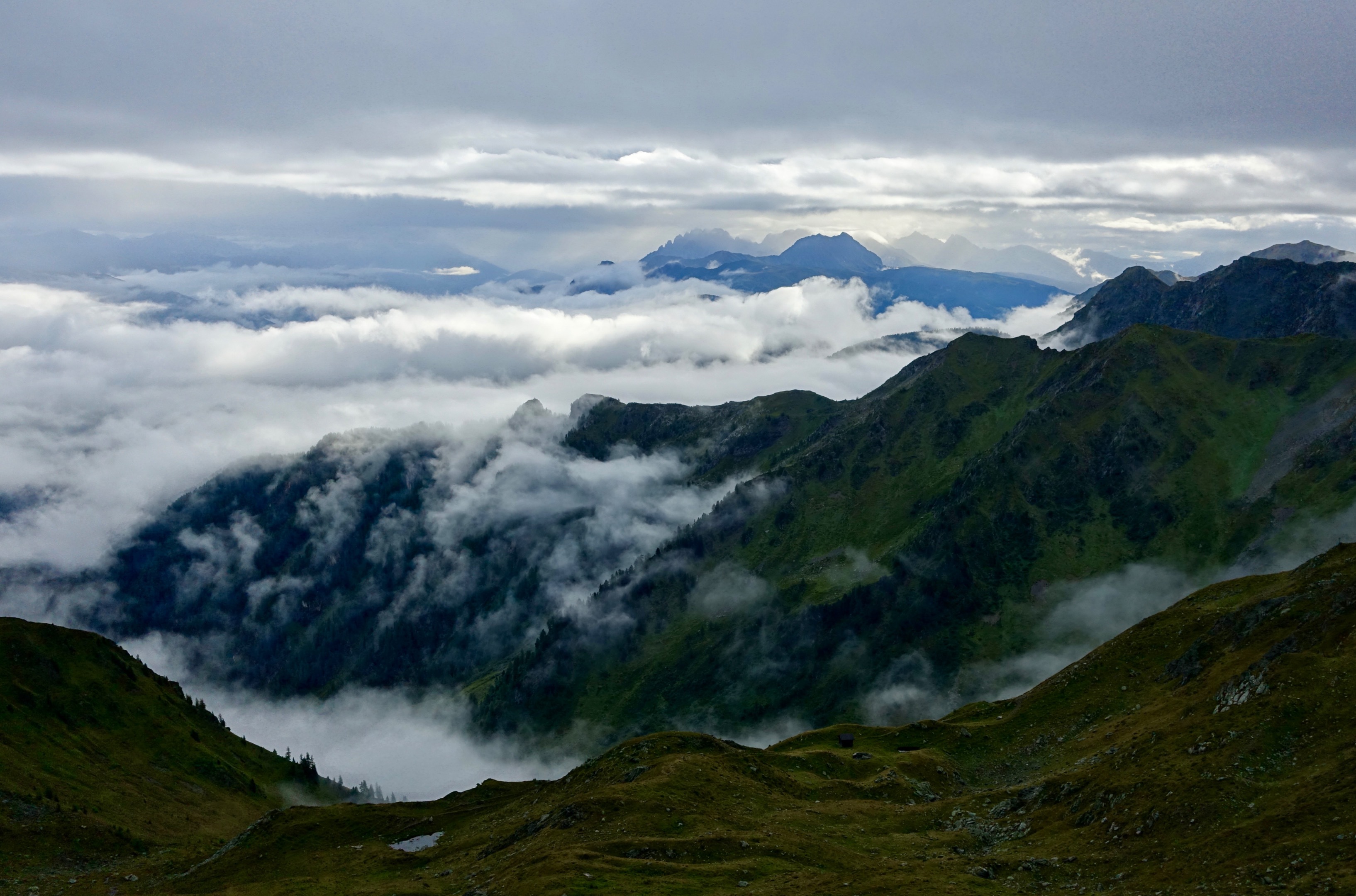… folgt Sonnenschein. Wir haben frühmorgens die Gunst der Stunde genutzt und sind bereits um 7.20 Uhr losgewandert. Nach dem Ruhetag waren wieder richtig begierig darauf, neue Wege in den Karnischen Alpen zu gehen. Nebelschwaden, einzelne Sonnenstrahlen und von Ferne leuchtende Berghänge ergaben eine ganz besondere Stimmung. Die Ruhe - und Schönheit - nach dem Sturm.