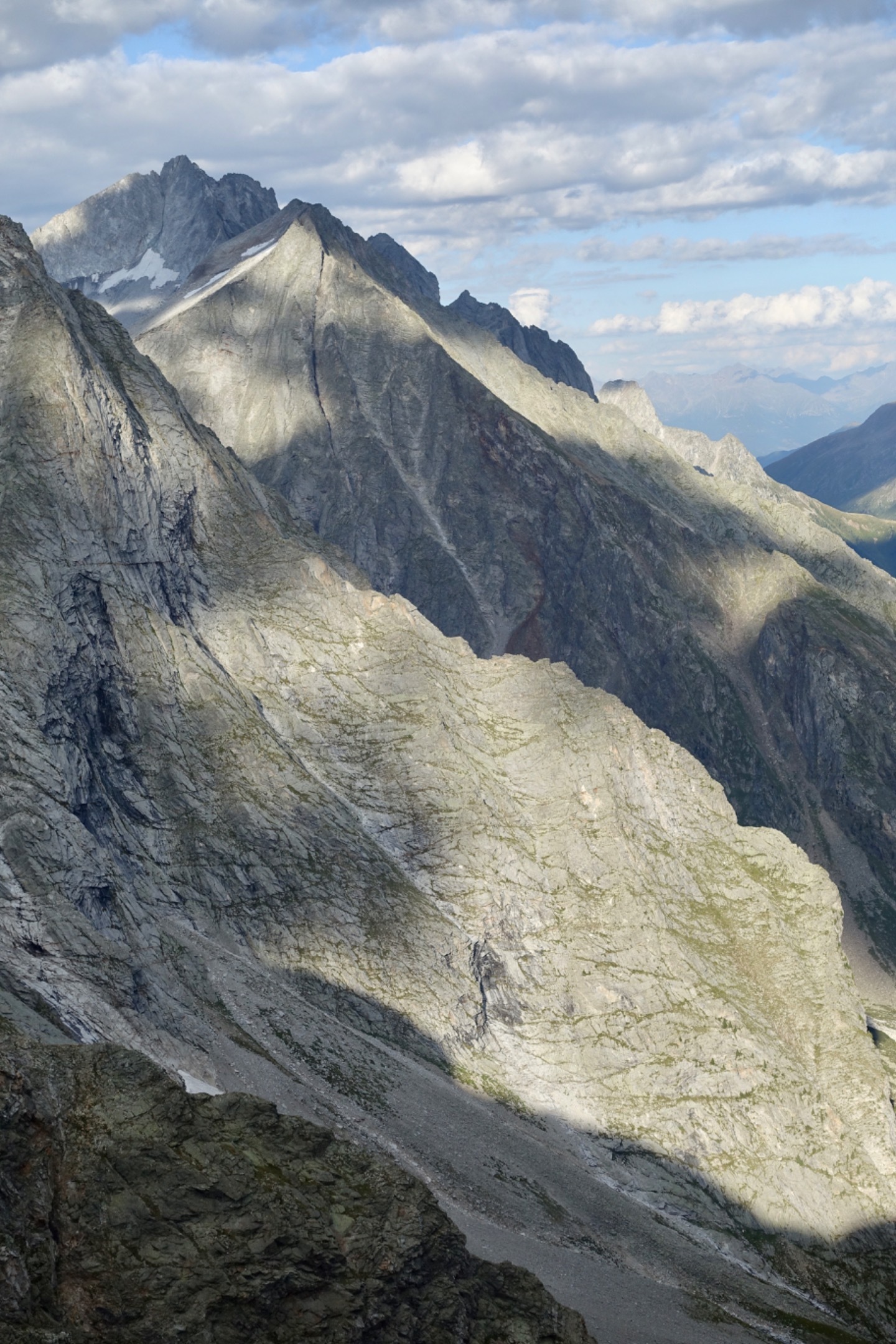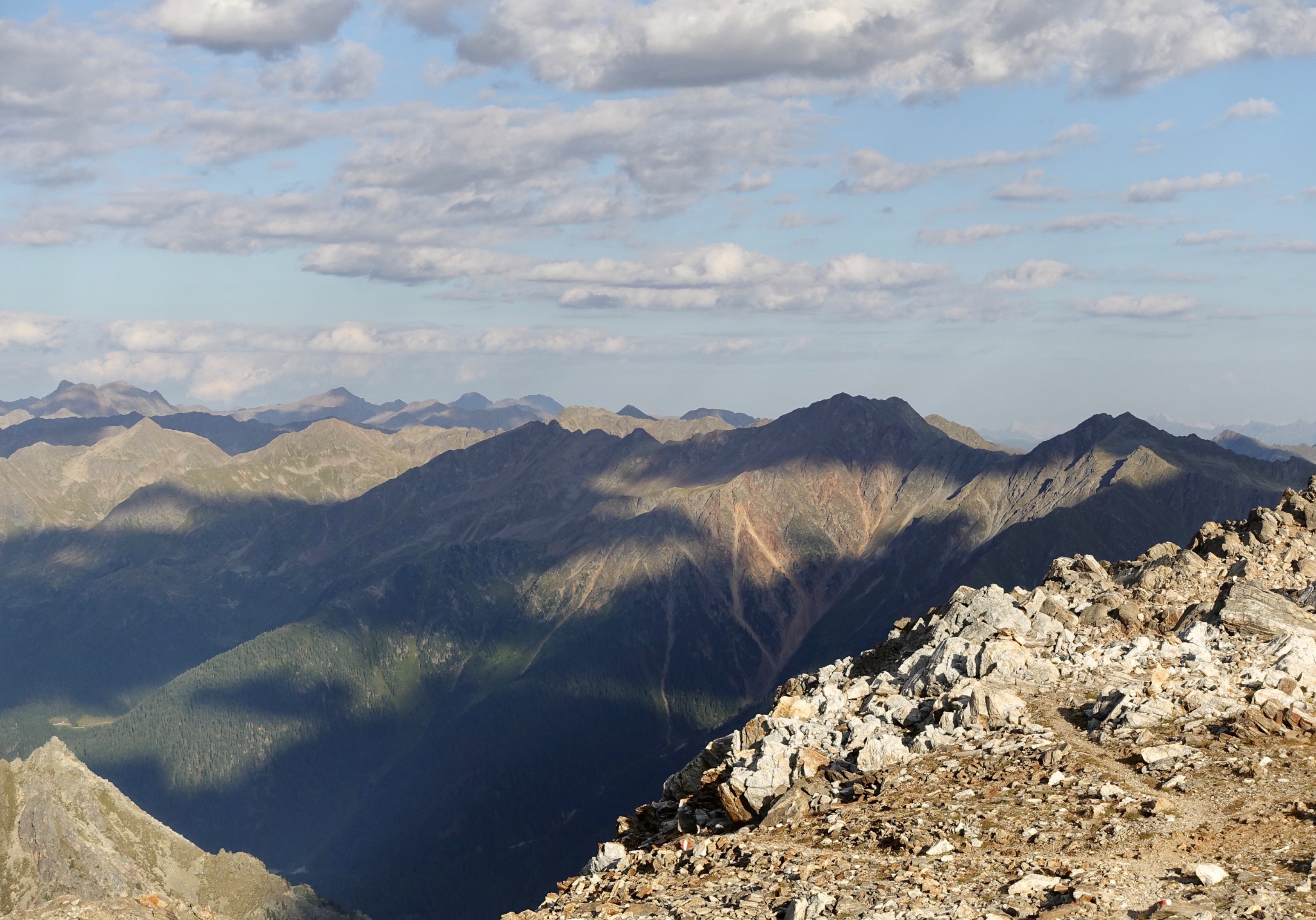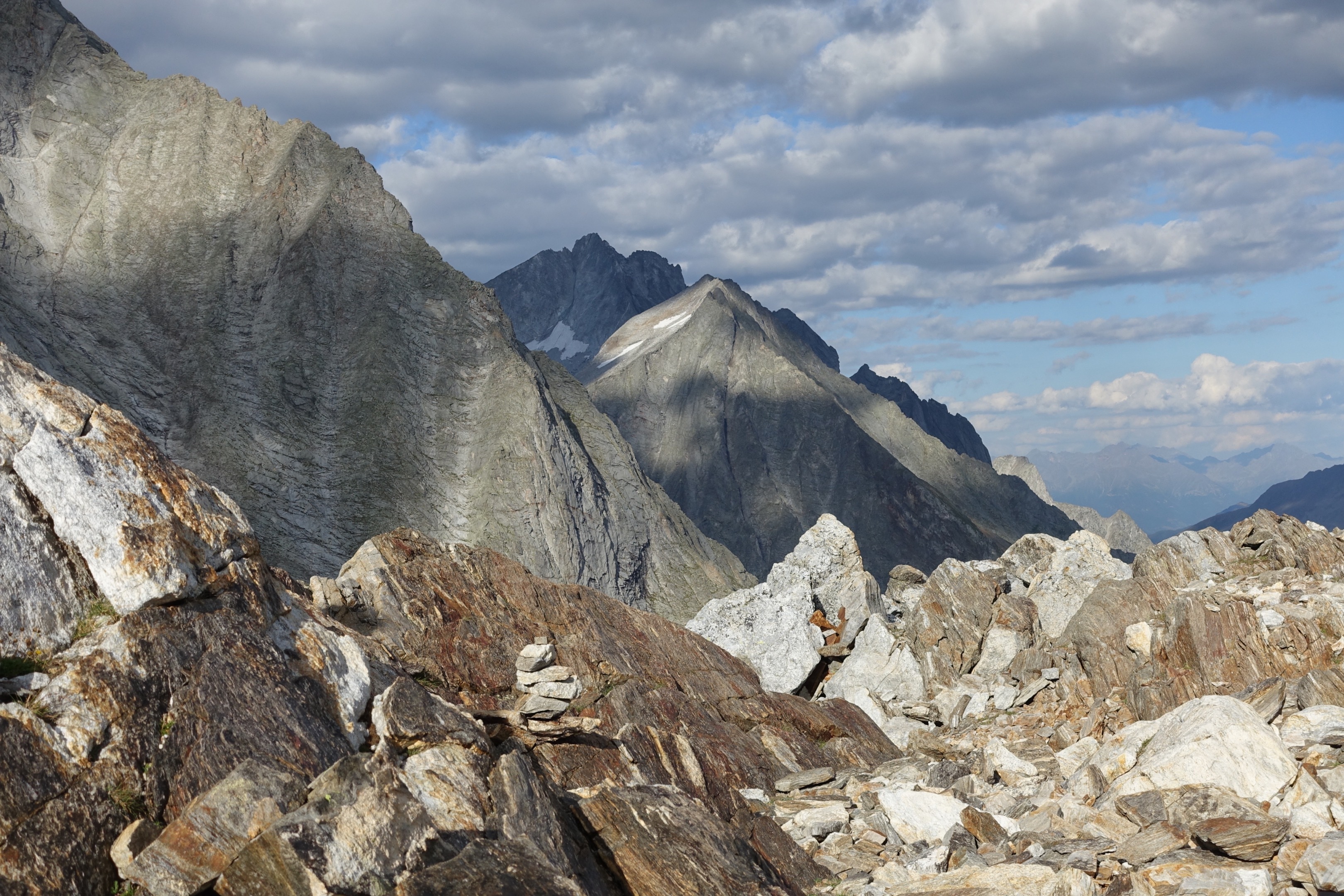 Nach einem stetigen und anstrengenden Aufstieg kamen wir heute bereits um 14 Uhr an unserem Tagesziel an - der Riesenfernerhütte auf 2800m. Als Belohnung für diesen schweisstreibenden Effort gönnten wir uns einen feinen Südtiroler Kaiserschmarren. Eine weitere Belohnung erwartete uns draussen am Rand des Abgrunds mit Blick ins Tal. Wir genossen die Faszination des Wolkenspiels in den vor uns liegenden Bergketten. Diese mächtigen Riesen strahlen soviel Ruhe und Schönheit aus. Ein Stück Ewigkeit.