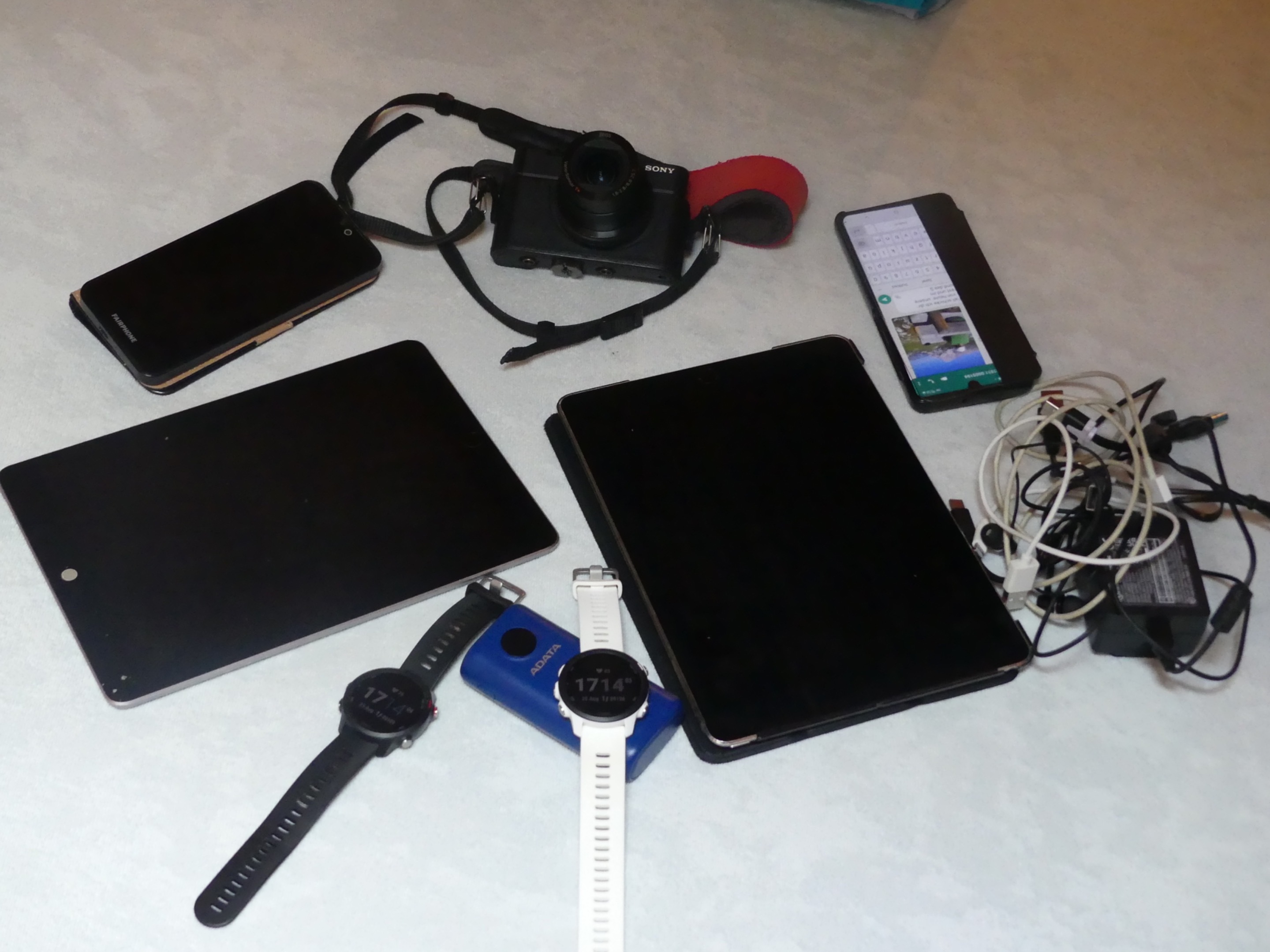 Obwohl wir beim besten Willen nicht mehr zu den Digital Natives gehören, tragen wir doch ein erstaunlich umfangreiches elektronisches Equipment mit uns über die Berge: 2 iPad, 2 Smartphones, 2 Fotoapparate, 1 Powerbank, 1 Mehrfach-Ladestecker, 2 GPS-Sportuhren und zu allem und jedem natürlich noch das eigene Ladekabel.