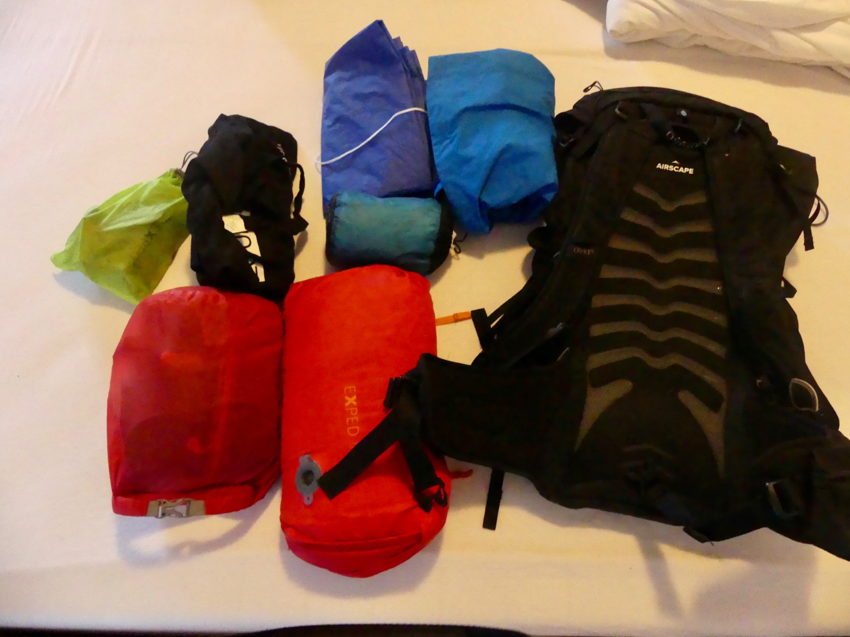 Seit Beginn unserer Wanderung haben wir 32 mal am Morgen unsere Siebensachen (es sind wohl eher 77 Sachen) zusammengetragen, fein säuberlich in die dafür vorgesehenen Säcklein und Säcke versorgt und wieder in den Rucksack verpackt. Wir sind darin schon von früheren Fernwanderungen recht routiniert, wenn es drauf ankommt, sind wir vom Aufstehen bis zum Loswandern in 30 Minuten startklar (bummeln geht natürlich immer).