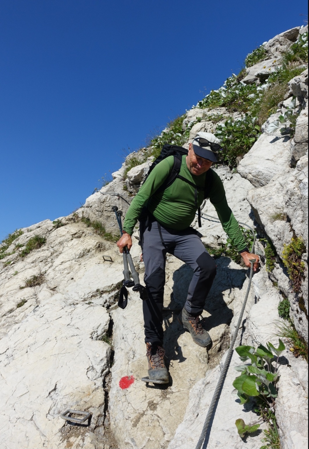 Hilfreich sind auch Tritthilfen. Das sind Bleche oder gebogene Armierungseisen, die im Fels verankert sind und die wie Treppenstufen über rutschige Felspartien führen. Meist hat es da gleich noch ein Seil daneben. Auch davon hatte es auf der heutigen Tour einige.
