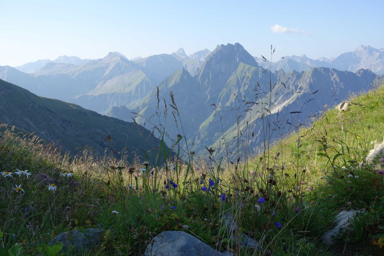 vorbei an rauschenden Bächen und widerkäuenden Kuhherden. Das Wetter ist herrlich, vor allem am frühen Morgen, wenn es noch kühl ist. Im Schlussaufstieg zum Prinz Luitpold Haus auf 1846 m haben wir in der Sommerhitze doch noch ein wenig gelitten. Katzenwäsche, Mohn-/Kirschkuchen und ein Weissbier alkoholfrei haben uns aber rasch wieder in Schwung gebracht.