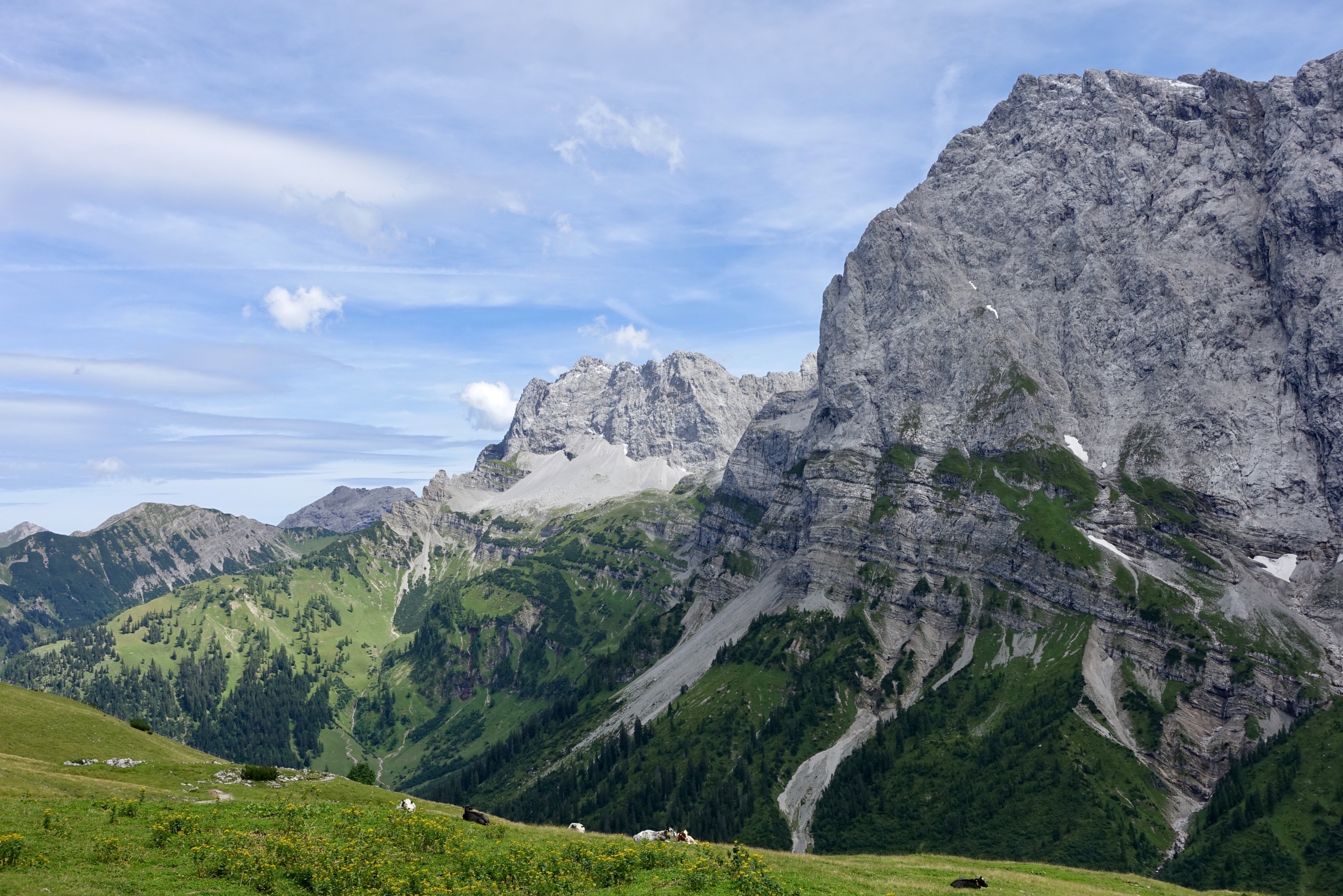 Nach einer überraschend guten Nacht im 12-er Massenlager stellten wir erfreut fest, dass sich die Wetterversprechungen für einmal bewahrheiten: Vor dem beschlagenen Fenster scheint die Sonne aus blauem Himmel und gibt bereits schön warm. So zogen wir richtig beschwingt los, durch eine wunderbare Landschaft mit wirklich atemberaubend schönen, leicht gezuckerten Bergen.  Seit gestern laufen wir übrigens auf der Via Alpina-Originalroute, nachdem wir uns die letzten zwei Tage von Innsbruck her angepirscht hatten. Wir werden sie auch ab und zu wieder verlassen, wenn uns ein Abstecher oder Umweg besser gefällt. Heute aber werden wir genau auf der Route Rast machen: In „der Eng“, einem hübschen Gasthaus mit Wellness-Bereich, feinem Essen, warmer Dusche, weicher Matratze und nur dem geliebten Wandergspänli als Zimmergenoss/in.