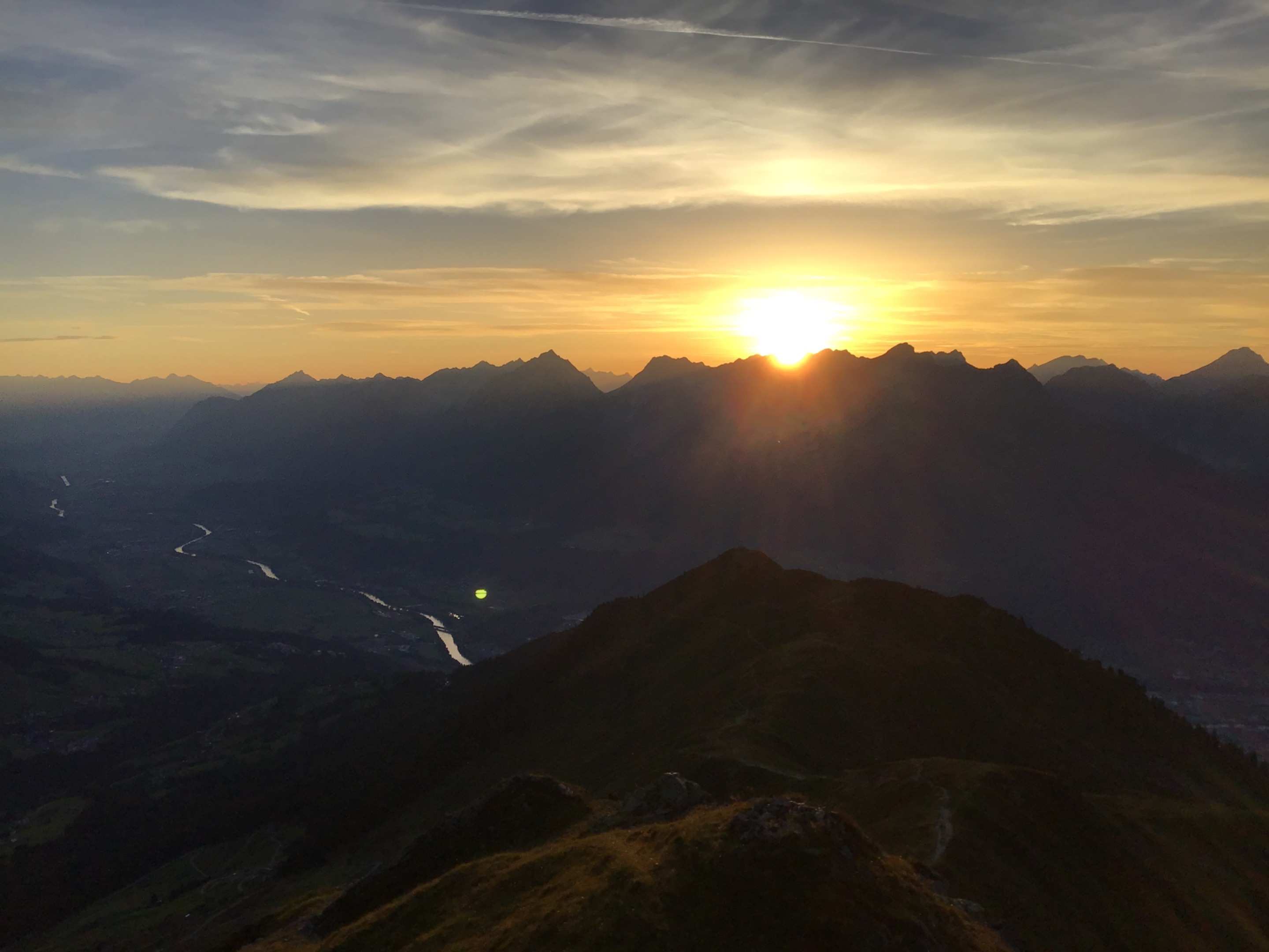 Diesen Sonnenuntergang haben wir auf der Terrasse der Kellerjochhütte geniessen dürfen nach einem wunderbar feinen Dreigangmenü. Dies mussten wir uns aber zuvor hart verdienen - die 1600 Höhenmeter hinauf zur Hütte waren kein Sonntagsspaziergang. Im Juli hatte es am bewaldeten Berghang gestürmt und einige grosse Tannen umgelegt und unseren Aufstieg noch weiter erschwert. Aber als wir dann am Ziel angekommen waren und die majestätischen Berge vor uns sahen, war das alles vergessen.