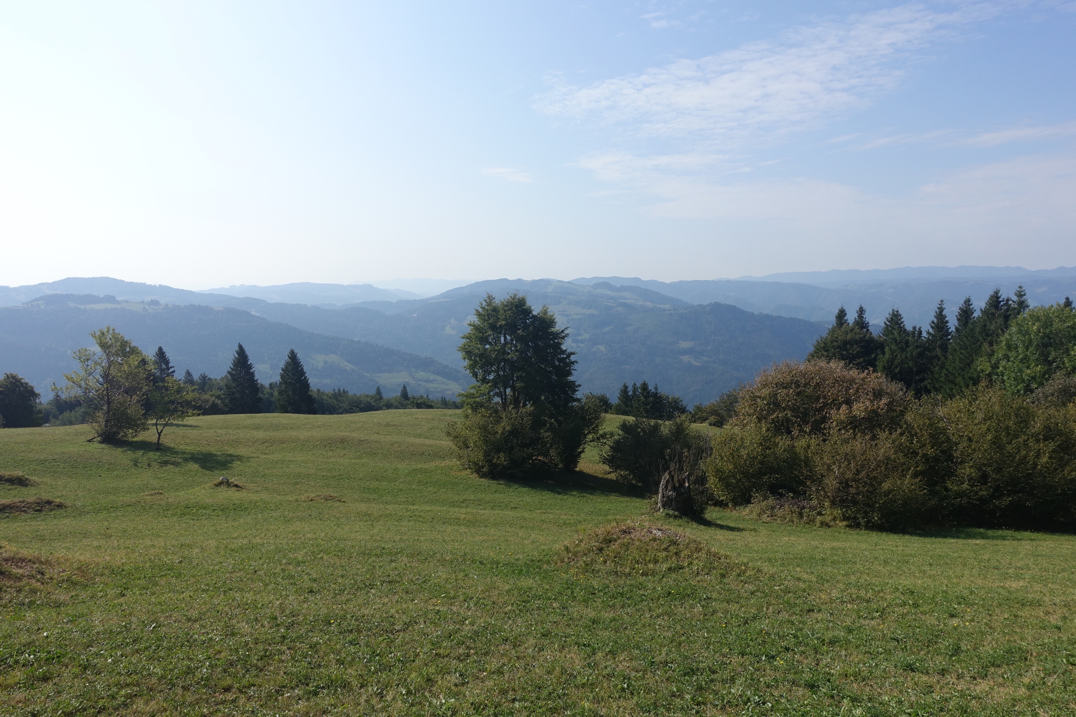 Und heute Morgen hat sich die Szenerie verändert. Oben auf dem Porezen blicken wir in den Süden. Ein liebliche Hügellandschaft tut sich auf - die Berge sind verschwunden.