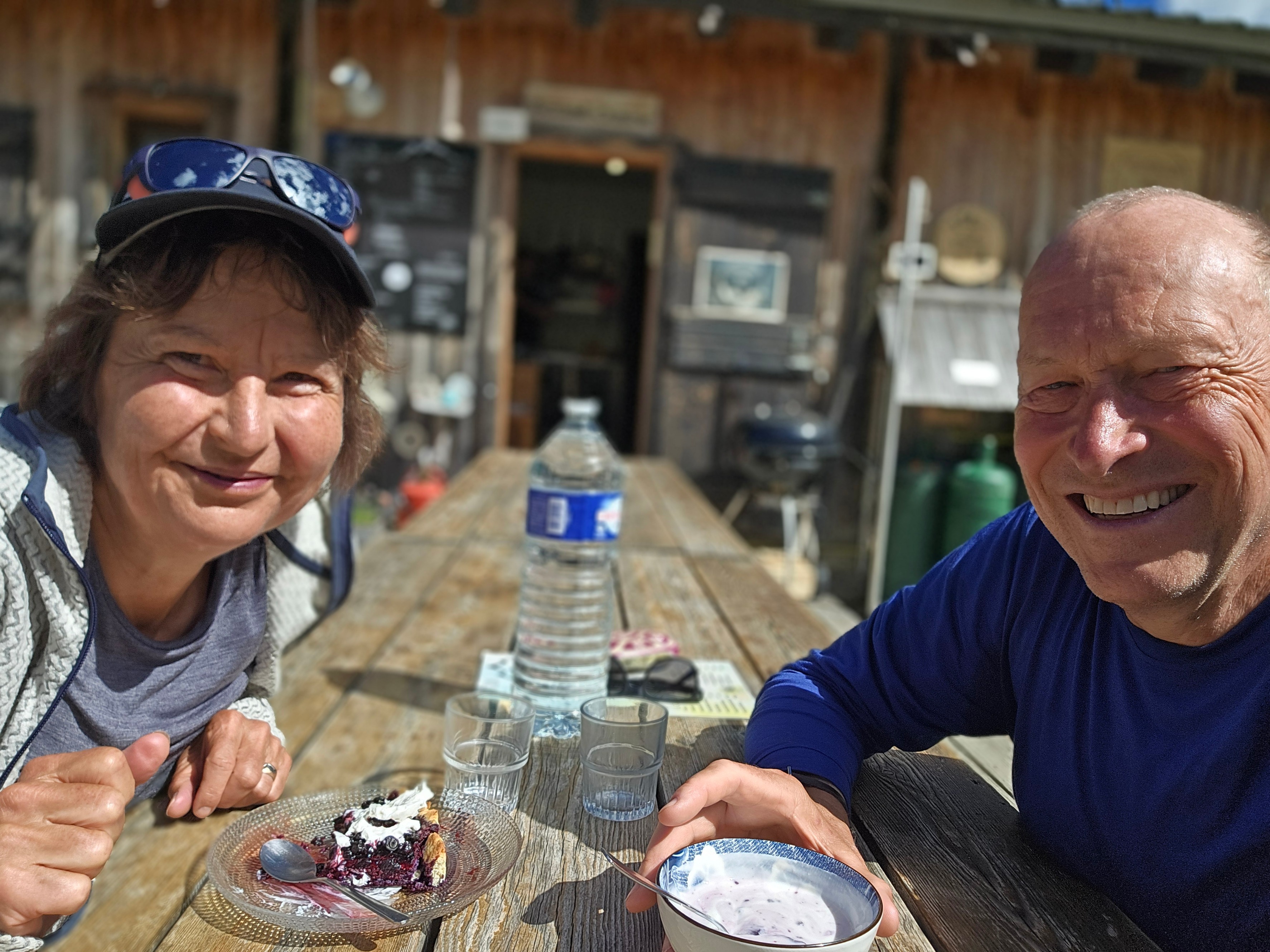 Es ist nun wunderbar und wir sind äußerst dankbar, dass Hansruedi mit seinen behandelten Gesundheitsthemen Herz und Asthma wieder mit viel Freude und Energie Strecken wie heute ohne Bedenken in Angriff nimmt. Nach vier Wochen Wandern laufen wir aktuell zur Höchstform auf. Wir sind schneller unterwegs als die von Komoot errechnete Zeit: 4.45 statt 5.30 Stunden. Ausserdem reguliert das Wandern unsere Verdauung und bei Hansruedi den Blutdruck.  Er wandert seit mehreren Wochen (in Absprache mit der Kardiologin) ohne Blutdrucksenker. Es ist wirklich beeindruckend,  was Bewegung ausmacht. Ich freue mich zutiefst über Hansruedis gesundheitliches Wohlbefinden.