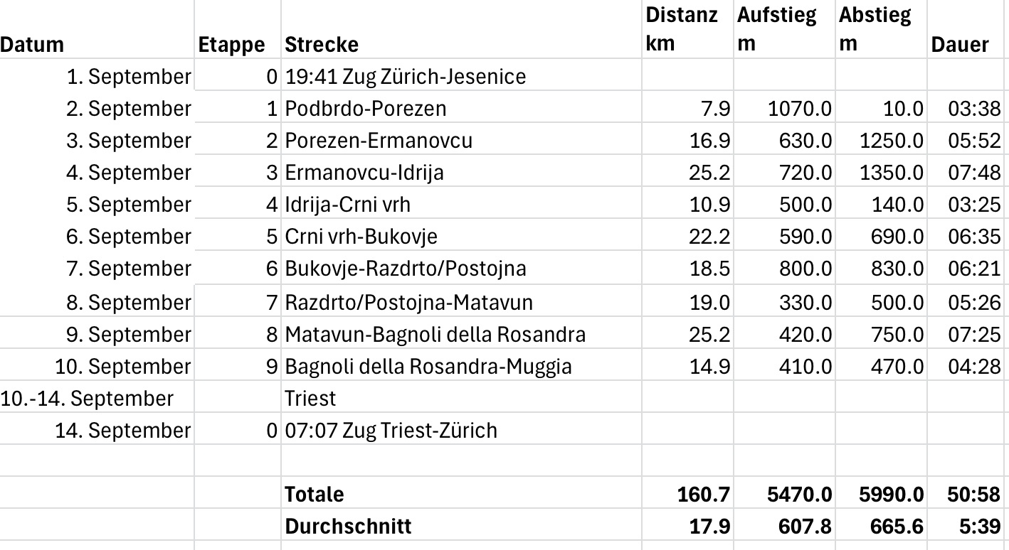 2023 wanderten wir während 6 Wochen von Innsbruck in Richtung Triest, mehr oder weniger auf der Originalroute. Leider ging unser Plan, bis ganz nach Triest zu wandern, nicht ganz auf. Die Hütten in Slowenien schlossen früher, als wir geplant hatten. So strandeten wir neun Etappen vor Triest im kleinen Dorf Podbrdo und brachen die Wanderung ab.