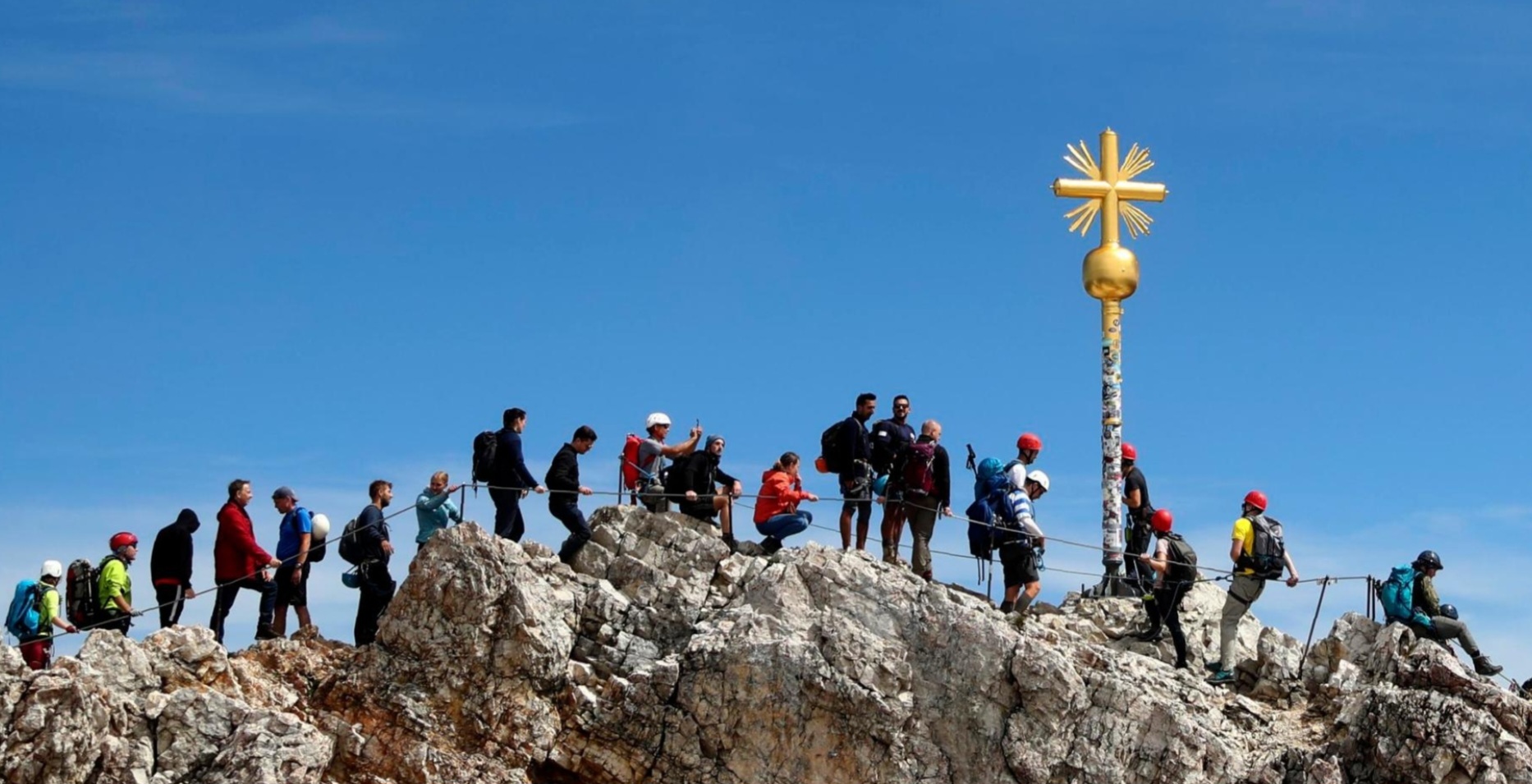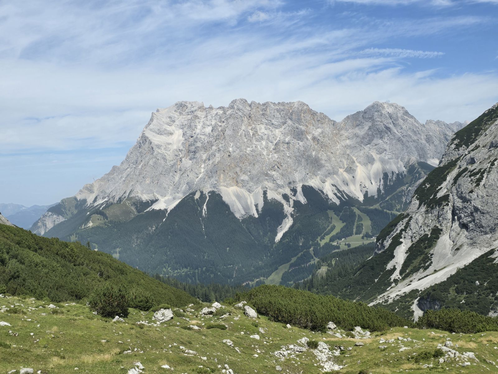 Es tut mir leid, wenn ich vorgestern falsche Erwartungen geschürt habe. Wir sind natürlich NICHT zur Zugspitze aufgestiegen. Das wäre erstens ein rechter Rüttler gewesen (2000 Höhenmeter ab Talgrund), zweitens suchen wir als Weitwandernde eher die Pässe als die Spitzen und drittens ist der höchste Punkt Deutschlands inzwischen völlig pervertiert. Dort oben befindet sich der höchste Biergarten Deutschlands, über 600'000 Besucher stürmen den Berg (mit der Seilbahn natürlich) und wer ein Selfie beim Gipfelkreuz machen will, muss ellenlang anstehen. Das alles können wir uns locker sparen.